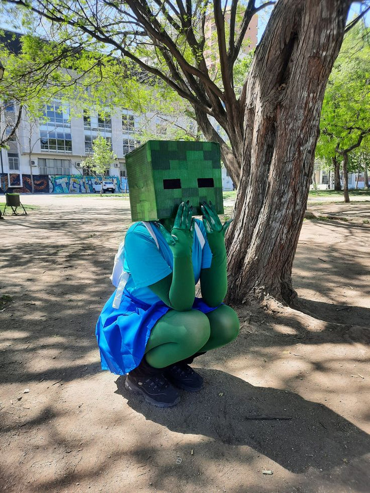 Get blocky and spooky with the Minecraft Zombie Costume. This outfit replicates the in-game zombie character with a blue and green pixelated design, complete with a square mask for that classic Minecraft look.